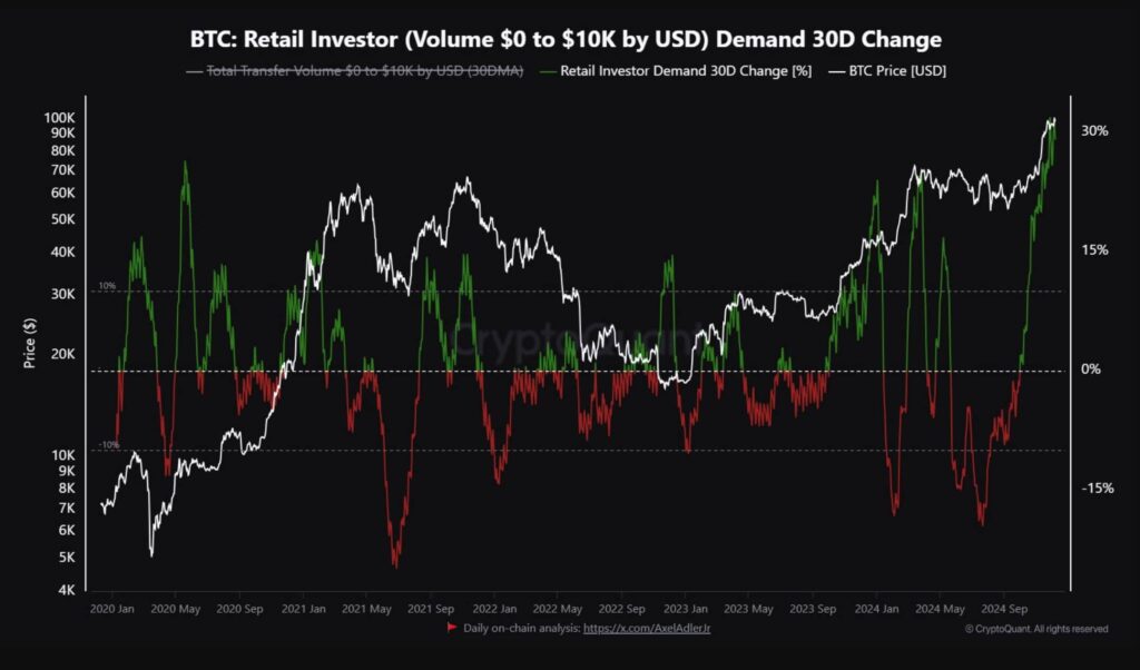 بنابراین، چه چیزی باعث شد قیمت بیت کوین به بالاترین سطح خود یعنی ۱۰۴٬۰۰۰ دلار برسد؟ مشابه بولرانهای قبلی، هیجانات خردهفروشی و هولدرهای کوتاهمدت هستند که تمام توجه را به خود جلب میکنند. دادههای اخیر نشان میدهد تقاضای خردهفروشی در ۳۰ روز گذشته به بالاترین حد سالانه رسیده است که نشاندهنده افزایش فعالیت در طول یک روند صعودی قوی است.