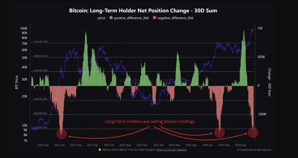 بر اساس دادههای آنچین، صعود قیمت بیت کوین به ۱۰۰٬۰۰۰ دلار، شاهد مقدار قابل توجهی فروش از سوی هولدرهای بلندمدت بوده است. برخی تحلیلگران میگویند این امر میتواند نشانه رسیدن به سقف احتمالی باشد که بازارها را نزولی کرده و معاملهگران را در شرایط آفساید قرار میدهد؛ یعنی زمانی که تقاضای سمت خرید شروع به کاهش میکند.