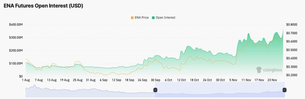 بر اساس دادههای کوین گلس (CoinGlass)، میزان سود باز اتنا ۲۳٪ افزایش یافته و به ۳۷۴ میلیون دلار رسیده است. مجموع لیکوییدیشن ENA نیز ۱.۲۹ میلیون دلار افزایش یافته، که ۳۳۵ هزار دلار آن مربوط به پوزیشنهای لانگ و ۹۵۶ هزار دلار مربوط به پوزیشنهای شورت است.