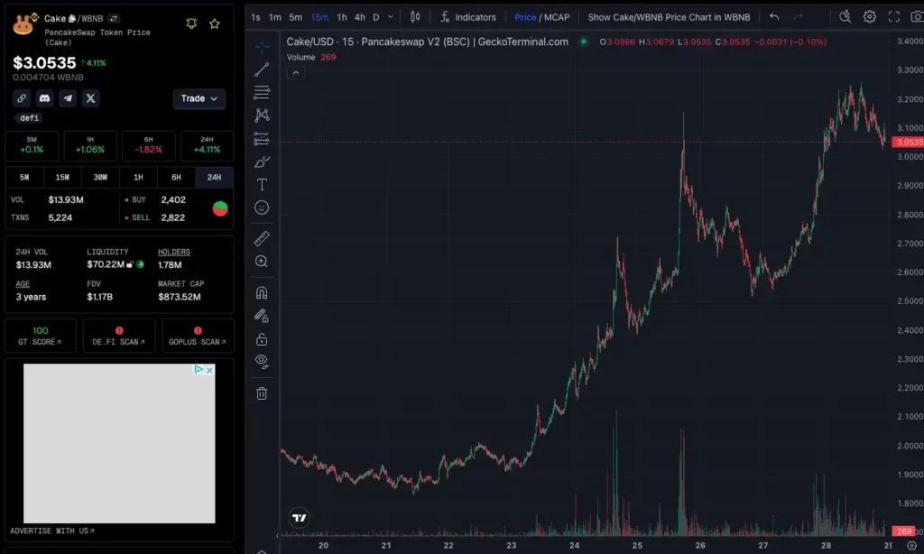 آلت کوین CAKE توکن بومی پلتفرم پنکیک سواپ است. براساس دادههای دون آنالیتیکس (Dune Analytics)، پنکیک سواپ بهطور مداوم در رتبه اول شبکه بیانبی قرار دارد و با صرافیهای غیرمتمرکز دیگر – از جمله یونی سواپ – فاصله زیادی دارد. عملکرد قدرتمند این توکن و جامعه کاربری گستردهاش باعث شده یکی از پروژههای شناخته شده دیفای در شبکه BSC باشد. مارکت کپ کیک برابر ۸۶۵.۹۸ میلیون دلار است و قیمتش در طول ۲۴ ساعت گذشته حدوداً ۰.۴۵٪ کاهش یافته است.