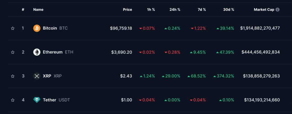 ریپل چند روز پیش توانسته بود از سولانا پیشی بگیرد و حالا تتر را پشت سر گذاشته است. در همین حال، بیت کوین در طول ۲۴ ساعت گذشته حدوداً ثابت باقی مانده و با قیمت ۹۶,۲۶۴ دلار معامله میشود. قیمت اتریوم نیز حدوداً ۱٪ در این بازه زمانی کاهش یافته و به ۳,۶۶۰ دلار رسیده است. قیمت سولانا حدوداً ۳.۴٪ افت کرده و با قیمت ۲۲۷.۲ دلار معامله میشود.