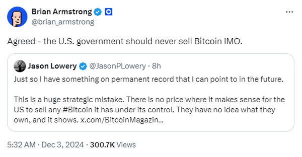 برایان آرمسترانگ (Brian Armstrong)، مدیرعامل کوین بیس نیز با انتشار پستی با نظر لوری مبنی بر عدم فروش بیت کوین توسط دولت ایالات متحده، موافقت کرد.