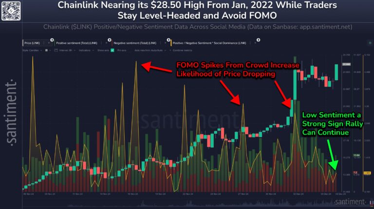 قیمت چین لینک اواخر هفته گذشته رشد قابل توجهی را تجربه کرد و اکنون تنها ۱۰.۸٪ با اوج ژانویه ۲۰۲۲ و ۵۲٪ تا اوج تاریخی ۵۲ دلاری سال ۲۰۲۱ خود فاصله دارد. بر اساس گزارش اخیر شرکت تحلیلی سنتیمنت، عدم هیجان گسترده در میان سرمایهگذاران خرد و نبود فومو نسبت به رشد اخیر، نشانهای دلگرمکننده برای تداوم روند صعودی این ارز دیجیتال محسوب میشود.