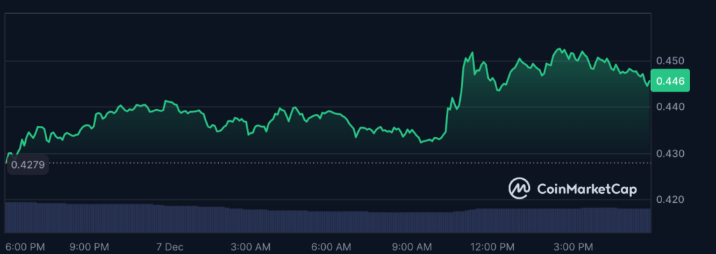 قیمت دوج کوین در طول ۲۴ ساعت گذشته حدود ۵٪ رشد کرده و به ۰.۴۴۶ دلار رسیده است. با این حال، حجم معاملات آن بیش ۲۲.۷٪ در طول ۲۴ ساعت گذشته کاهش یافته و به نزدیکی ۷ میلیارد دلار رسیده است. قیمت DOGE کمی بالاتر از کف ۰.۴۲۱۳ دلار قرار دارد.