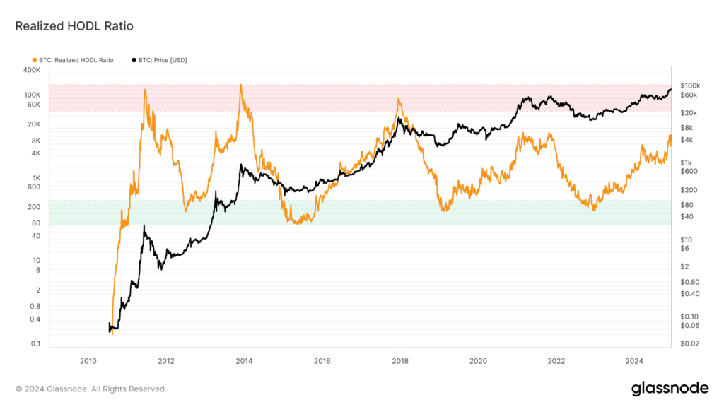 بر اساس دادههای گلسنود، نسبت RHODL بیت کوین برای قیمت بیت کوین بالاتر از منطقه سبز است که نشان میدهد دیگر در پایین نیست. در عین حال، نسبت هودل تحقق یافته زیر منطقه قرمز است که نشان میدهد قیمت بیت کوین به اوج خود نرسیده است. اگر این روند ادامه یابد، بیت کوین ممکن است به بالای بالاترین سقف خود یعنی ۱۰۴,۰۸۸ دلار صعود کند.