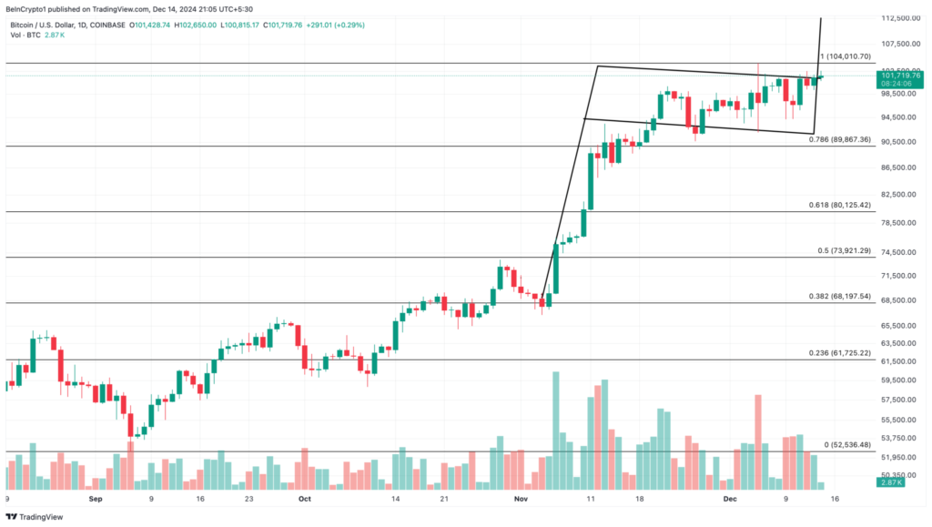 در ۱۴ دسامبر (۲۴ آذر)، قیمت بیت کوین در حال آزمایش خط روند بالایی کنج در حدود ۱۰۱,۹۰۰ دلار به عنوان مقاومت بود و به دنبال بازگشت به سمت خط روند پایینتر در حدود ۹۷,۵۰۰ دلار بود. این سطح با میانگین متحرک نمایی ۲۰ روزه (موج بنفش) همسو است.