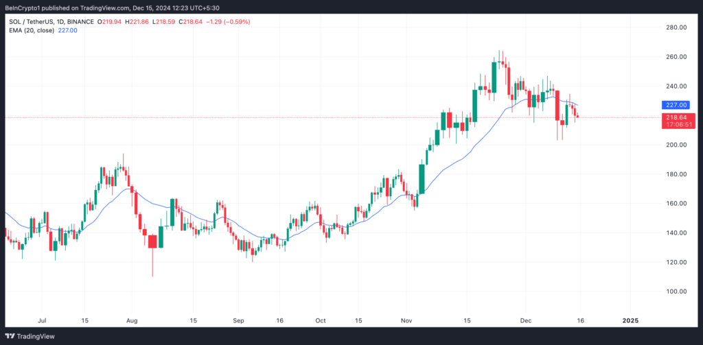 علاوه بر این، کاهش ارزش سولانا در هفتههای اخیر باعث شده قیمت SOL به زیر میانگین متحرک نمایی ۲۰ روزه (EMA) برسد. این اندیکاتور قیمت یک دارایی در بازه زمانی ۲۰ روزه را اندازهگیری میکند و البته وزن بیشتری به قیمتهای اخیر میدهد.