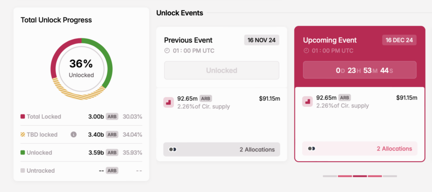 هفته آینده آربیتروم قرار است ۹۲.۶۵ میلیون واحد توکن ARB که حدودا ۹۱ میلیون دلار قیمت دارند را آنلاک کند. این توکنها به تیم توسعه، مشاوران و سرمایهگذاران اختصاص دارند.