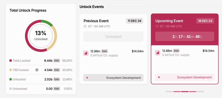 در تاریخ ۱۸ دسامبر قرار است این پروژه بیش از ۱۲ میلیون واحد توکن ENA که به توسعه اکوسیستم اختصاص دارد را آنلاک کند.