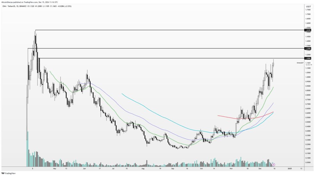 آلت کوین ENA از نظر ارزش بازار جایگاه ۴۸ام را به خود اختصاص داده، در طول ۳ ماه گذشته بیش از ۵ برابر شده و در زمان نگارش مطلب، قیمت اتنا ۱.۱۵ دلار است. اتنا در طول ۲۴ ساعت گذشته ۰.۹۴٪ کاهش یافته است.