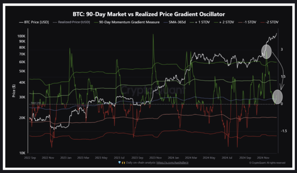 علاوه بر این، پرسیوال با کمک نمودار نوسانگر گرادیان قیمت بازار ۹۰ روزه در مقابل قیمت تحقق یافته، توضیح داد که این شاخص در منطقه تعادل ۰.۵ قرار دارد که نشان دهنده موقعیت خنثی بین خریداران و فروشندگان است.