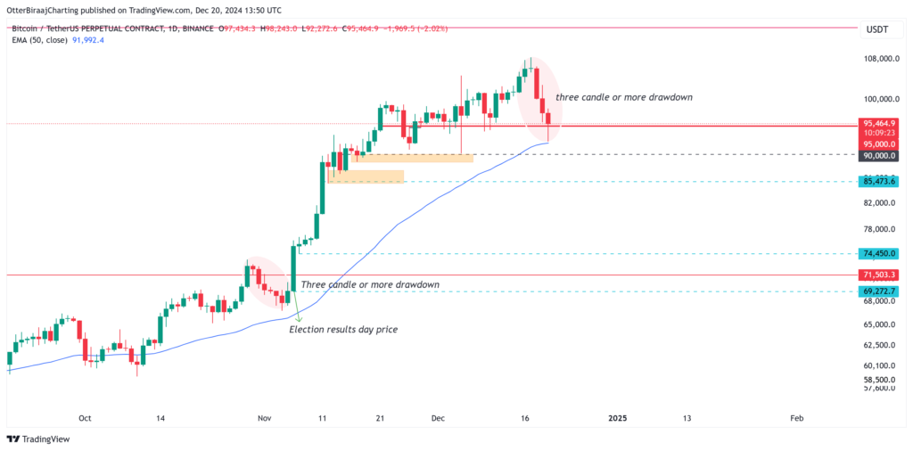 به گزارش میهن بلاکچین، بیت کوین در نمودار روزانه دو کندل قرمز متوالی ثبت کرده است. همچنین، قیمت BTC مجدداً EMA 50 را آزمایش کرده است. پس از آنکه بیت کوین از اوج تاریخی خود ۱۵٪ کاهش یافت، یک تحلیلگر اعلام کرد که احتمالاً بیشتر اصلاح بازار به پایان رسیده است.
