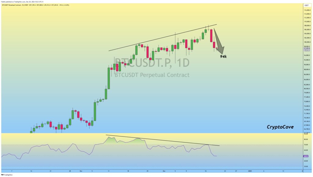 یک شکست نزولی در نمودار میانمدت بیت کوین به چشم میخورد. با این حال، اگر کندلهای روزانه بیت کوین همچنان بالای ۹۵,۰۰۰ دلار بسته شوند، ممکن است که این روند نزولی بیاعتبار شود.