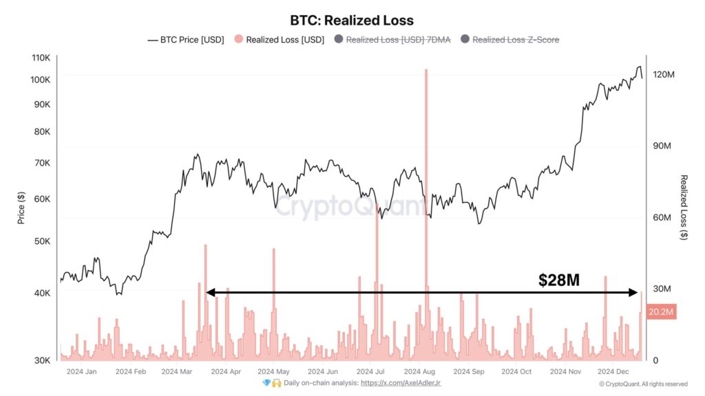 با افزایش فشار فروش، حجم زیانهای تحققیافته نیز از میانگین هفتگی خود فراتر رفت. الکس آدلر جونیور (Alex Adler Jr)، تحلیلگر آنچین بیت کوین اعلام کرد زیانهای تحققیافته بیت کوین در طول ۵ روز گذشته به ۲۸.۹ میلیون دلار رسیده و از میانگین هفتگی سال ۲۰۲۴ حدود ۳۲۰٪ بیشتر بوده است. سقف ۲۸ میلیون دلاری ضررهای تحققیافته تنها ۱۰ بار در سال ۲۰۲۴ شکسته شده است.