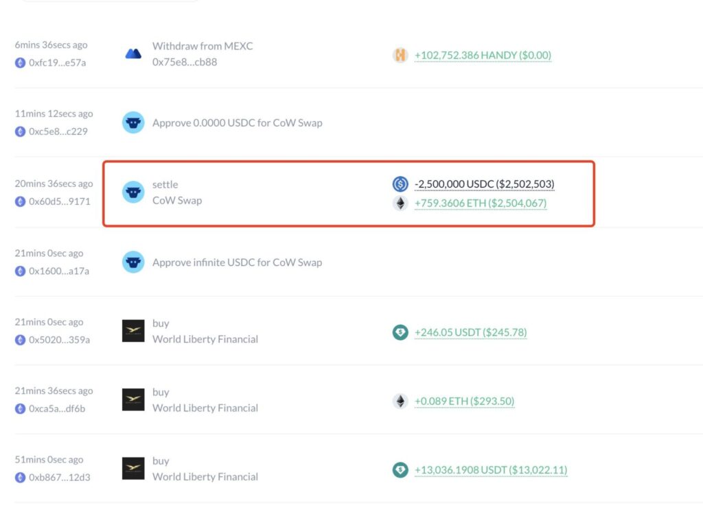 فعالیت نهنگهای اتریوم نشاندهنده علاقه مجدد سرمایهگذاران بزرگ به این آلت کوین است. از سوی دیگر، ورلد لیبرتی فایننشال (World Liberty Financial) – پروژه دیفای ترامپ – به انباشت اتریوم ادامه داده و با پرداخت ۲.۵ میلیون دلار استیبل کوین USDC، حدود ۷۵۹ واحد ETH دیگر نیز خریداری کرده است.