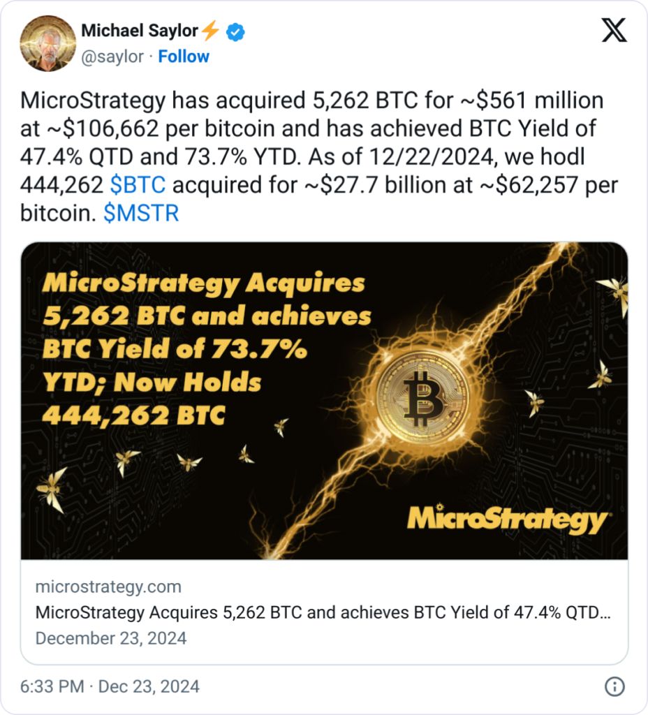 به گزارش میهن بلاکچین و بر اساس اطلاعیه منتشرشده، شرکت مایکرواستراتژی در بازه بین ۱۶ تا ۲۲ دسامبر ۵۲۶۲ واحد بیت کوین با ارزشی بالغ بر ۵۶۱ میلیون دلار را خریداری کرده و به ذخایر خود افزوده است.