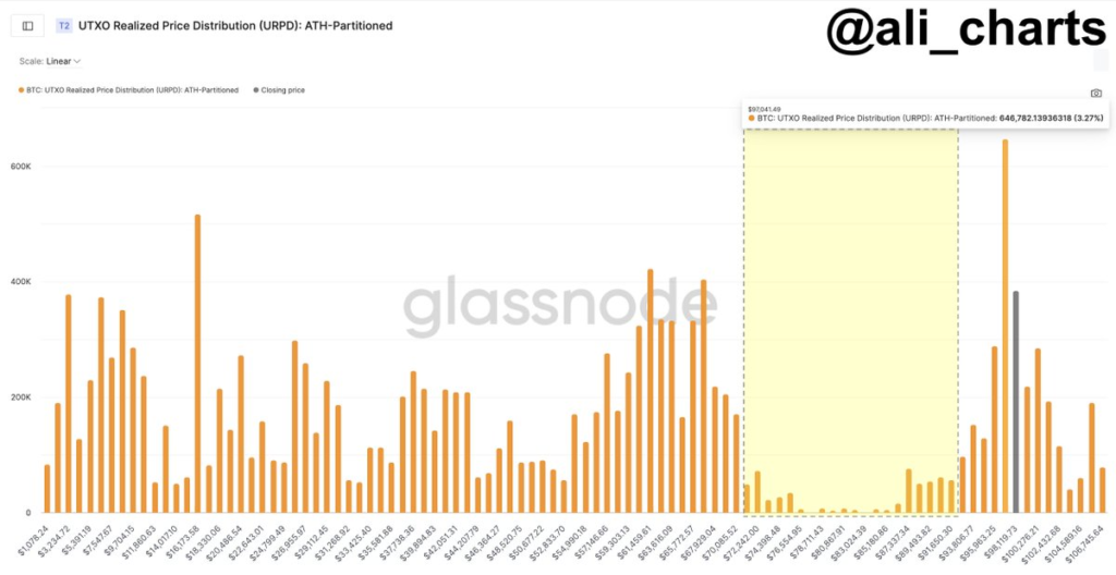 به گزارش میهن بلاکچین، علی مارتینز، معاملهگر شناختهشده، به ۱۰۲,۴۰۰ دنبالکننده خود در شبکه اجتماعی X اعلام کرده که اگر بیت کوین یک محدوده حمایتی کلیدی را از دست بدهد، ممکن است بیش از ۲۴٪ از ارزش فعلی خود کاهش پیدا کند.