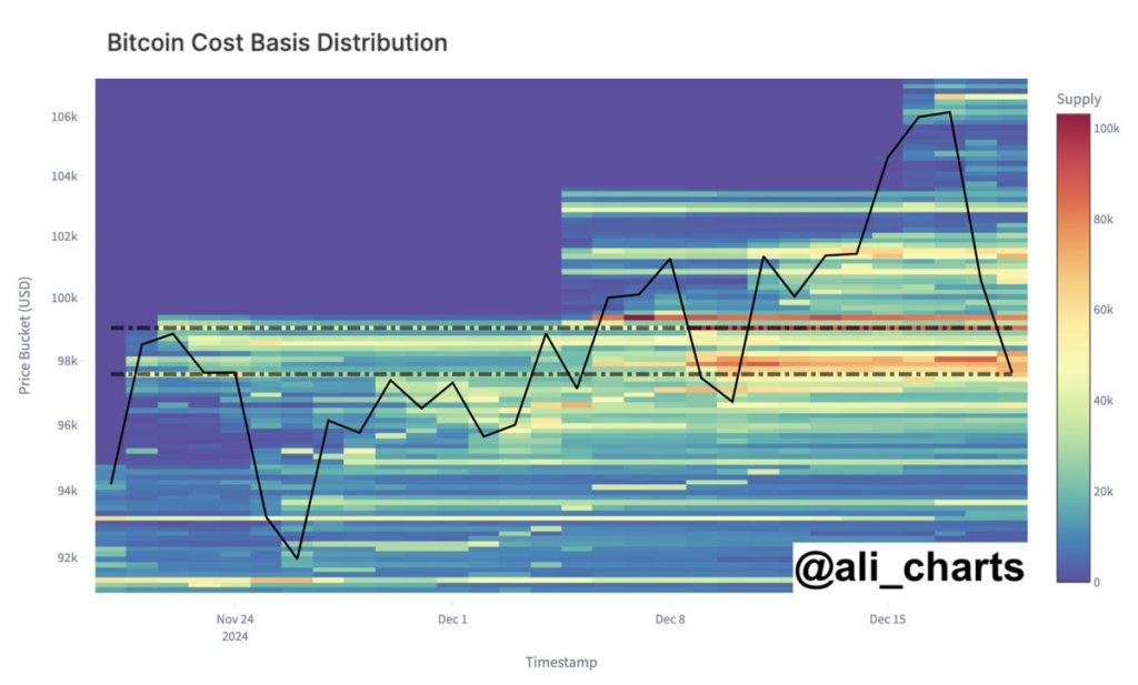 مهمترین آستانه حمایتی برای بیت کوین بر اساس توزیع قیمت خرید، بین ۹۹,۰۰۰ تا ۹۷,۰۰۰ دلار است. ما واقعاً نمیخواهیم این سطح به مقاومت تبدیل شود… عرضهای که بین ۹۷,۰۰۰ تا ۹۹,۰۰۰ دلار به دست آمده، هنوز فروخته نشده است. بنابراین چیزی که باید انتظار داشت، یک حرکت قاطع است تا همه افرادی را که در این سطح خرید کردهاند، به فروش تشویق کند و در این صورت تأیید میکند که سطح حمایت شکسته شده است.
