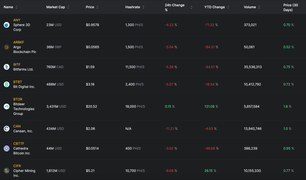 از میان ۲۵ شرکت موجود در این شاخص، تنها ۷ شرکت در طول سال سودآور بودهاند. قیمت سهام بیت دیر (BTDR) در طول سال گذشته ۱۶۵.۳٪، سایفر (CIFR) حدوداً ۳۳٪ و هات (HUT) تقریباً ۹۱٪ افزایش یافته است. همچنین سهام آیریس انرژی (IREN) در طول این بازی زمانی ۷۳٪ رشد کرده، نورثرن دیتا (NB2) تقریباً ۶۲.۱۶٪، کور ساینتیفیک (Core Scientific) نیز ۳۳۴.۸۸٪ و تراولف (WULF) بیش از ۱۷۰٪ افزایش یافته است.