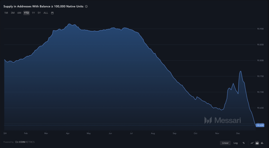 دادههای آنچین این سناریوی نزولی را تایید میکنند، زیرا معیارهای مربوطه نشان میدهند نهنگها در حال توزیع توکنهایشان هستند.
