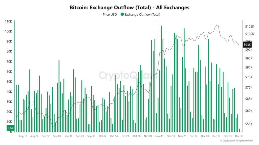 روند کلی خروج بیت کوین از صرافیها در دسامبر ۲۰۲۴ نزولی بود. با این حال، در اواخر ماه، همزمان با کاهش قیمت، شاهد افزایش خروج بیت کوین از صرافیها بودیم که نشاندهنده افزایش فشار فروش و تمایل سرمایهگذاران به نگهداری بیت کوین در کیف پولهای شخصی است.