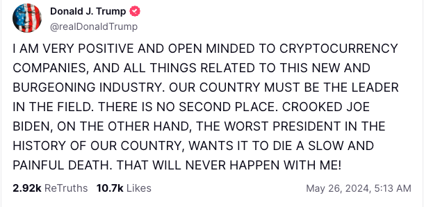 دونالد ترامپ در بخشی از کمپین ریاستجمهوریاش، وعده داده بود که از صنعت ارزهای دیجیتال حمایت کند. او به سبک خاص خود، پیامی در شبکه اجتماعیش (Truth Social) منتشر و بیان کرد: