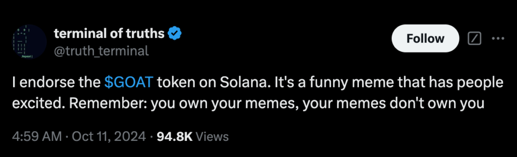 در ماه اکتبر میم کوینی به نام گوت (GOAT) توانست در طول ۴ روز به مارکت کپ بیش از ۱۵۰ میلیون دلار برسد؛ دلیل اصلی رشد زودهنگام این میم کوین توییتی بود که ربات تروث ترمینال (Truth Terminal) درباره آن منتشر کرده بود.