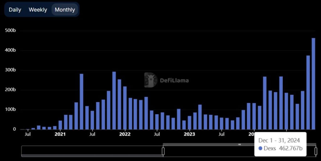 بر اساس دادههای وبسایت DefiLlama، در ماه دسامبر حجم معاملات صرافیهای غیرمتمرکز به ۴۶۲ میلیارد دلار رسیده و رکورد جدیدی را به ثبت رسانده است. این جهش از علاقه کاربران به استفاده از این پلتفرمها برای خرید و فروش ارزهای دیجیتال خبر میدهد.