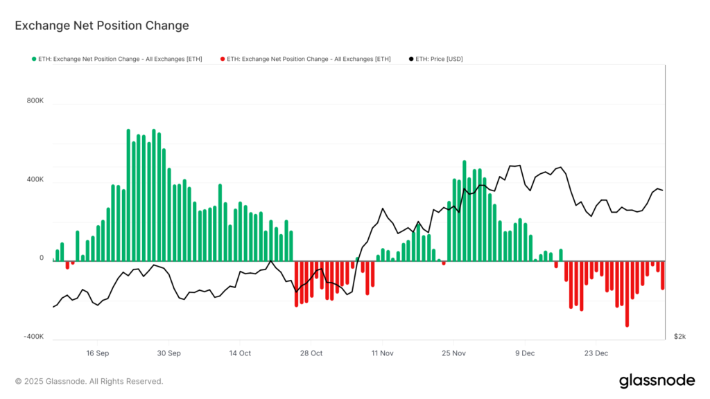 خروج ۸۹,۰۰۰ اتریوم (به ارزش تقریبی ۳۲۳ میلیون دلار) از صرافیها، نشاندهنده افزایش میزان انباشت است، زیرا سرمایهگذاران داراییهای خود را از صرافیها خارج کرده و برای نگهداری بلندمدت ذخیره میکنند.