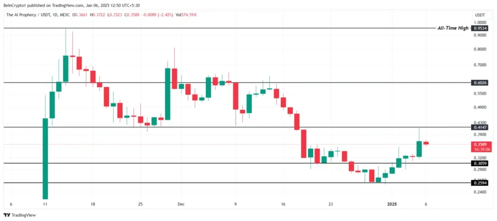 قیمت اکت پس از رسیدن به سطح ۰.۲۵ دلار در اواخر ماه دسامبر ۲۰۲۴، اکنون به ۰.۳۵ دلار رسیده است. این آلت کوین با نام کامل The AI Prophecy در حال نزدیک شدن به مقاومت ۰.۴۱ دلار است و شتاب بازار نشان میدهد که احتمال آن وجود دارد که ACT در کوتاهمدت از این سطح عبور کند.