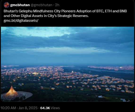 بوتان با گامی جسورانه وارد عصر اقتصاد دیجیتال شد. شهر Gelephu Mindfulness City (GMC)، منطقه ویژه اداری جدید بوتان، اعلام کرد که بیت کوین (BTC)، اتریوم (ETH) و بایننس کوین (BNB) را به بخشی از ذخایر استراتژیک خود اضافه میکند.