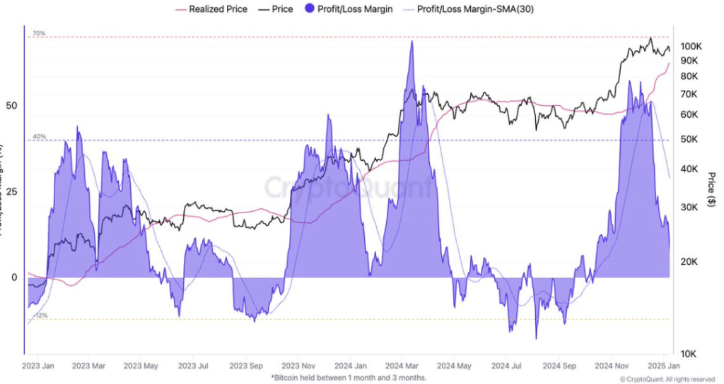سود تحققیافته آنچین معاملهگران بیت کوین و حاشیه سود/ضرر – منبع: CryptoQuant