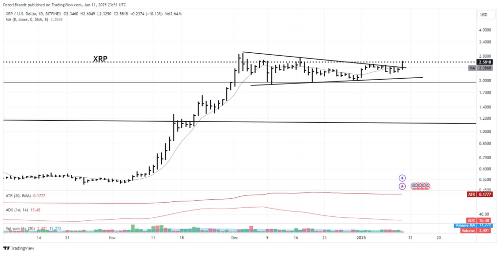 وی در پستی در شبکه اجتماعی X در تاریخ ۱۲ ژانویه (۲۳ دی)، نمودار قیمت ریپل را به اشتراک گذاشت که نشاندهنده شکست واضح الگوی پرچم صعودی در تایمفریم روزانه بود. او با اشاره به ریپل بهعنوان «رهبر بازار» تأکید کرد که این رمزارز احتمالاً در سال ۲۰۲۵ یک حرکت صعودی قوی را تجربه خواهد کرد.