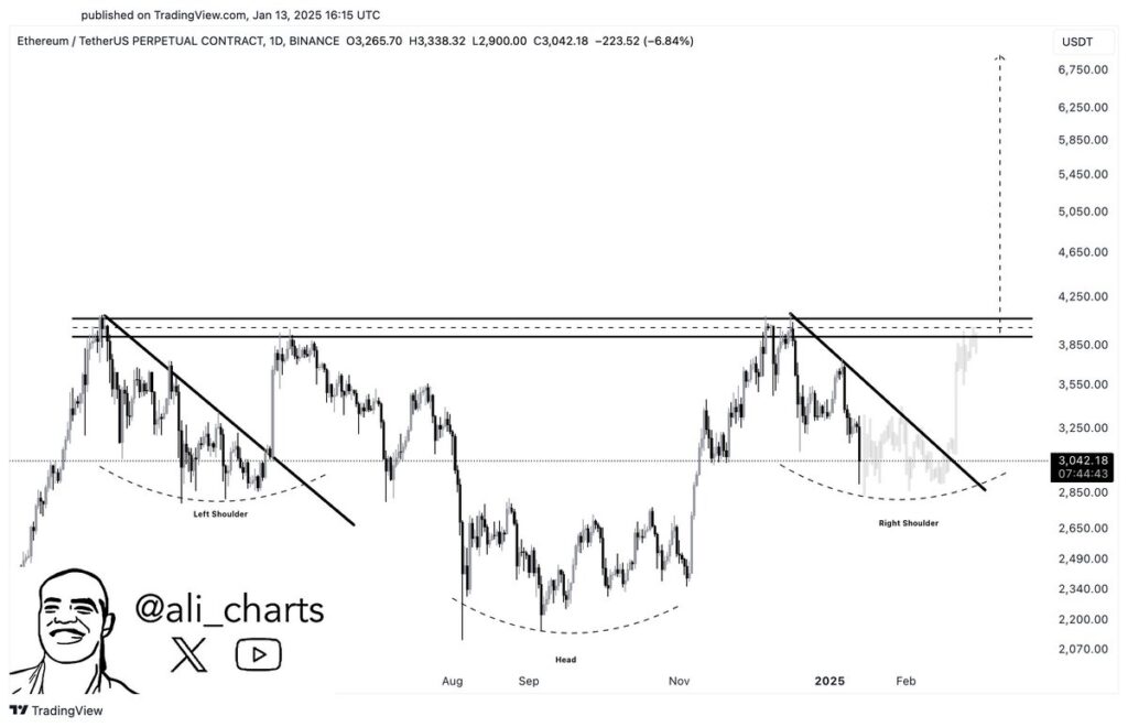 بر اساس نمودار ارائهشده توسط مارتینز، اتریوم در تایم فریم روزانه خود در حال تکمیل یک الگوی سر و شانه معکوس است. معاملهگران از این الگو در تحلیل تکنیکال معمولا برای شناسایی احتمال بازگشت روند از یک روند نزولی استفاده میکنند. مارتینز در این باره میگوید: