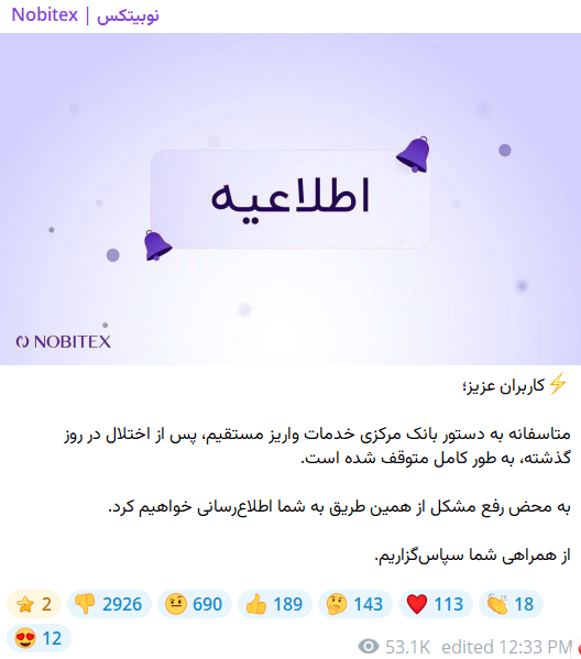 صرافی نوبیتکس در اطلاعیه خود نوشته که به دستور بانک مرکزی، خدمات واریز مستقیم پس از اختلال روز گذشته به طور کامل متوقف شده و خاطرنشان کرده که به محض رفع این مشکل اطلاعیه دیگری صادر خواهد کرد.