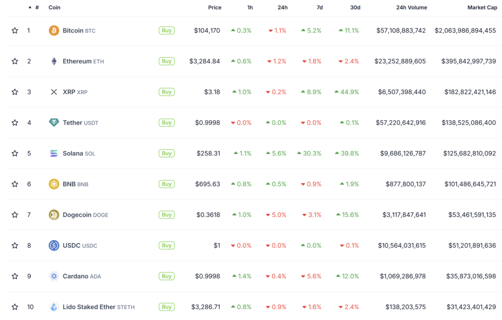عملکرد ۱۰ ارز دیجیتال برتر بازار – منبع: CoinGecko