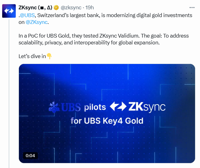 به گزارش میهن بلاکچین، این بانک که بیش از ۵.۷ تریلیون دلار دارایی را مدیریت میکند، اخیرا فاز آزمایشی (Proof-of-Concept) محصول سرمایهگذاری UBS Key4 Gold را روی شبکه زدکی سینک ولیدیوم (ZKsync Validium) اجرا کرده است.
