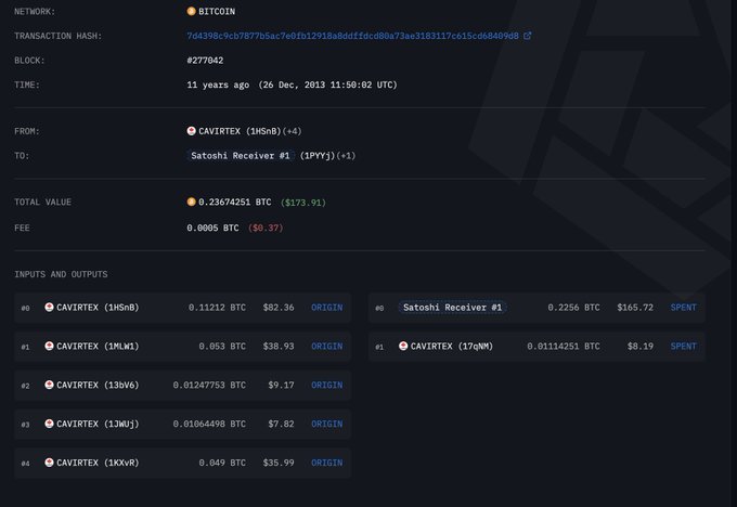 ۲۴ تراکنش ثبتشده از این آدرسها به دیگر آدرسها انجام شده است. یکی از مهمترین آدرسهایی که بیت کوین از آن ارسال شده، آدرس 1pYYj است. جالب است که این آدرس بیت کوین از کاویرتکس دریافت کرده است.