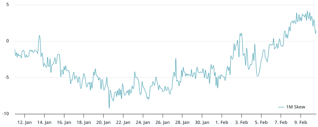 انحراف دلتای ۲۵٪ برای آپشنهای بیت کوین، که آپشنهای فروش (put) و خرید (call) مشابه را مقایسه میکند، معیار مناسبی برای سنجش احساسات بازار است. در شرایط صعودی، آپشنهای فروش با تخفیف معامله میشوند و این شاخص را به زیر ۵٪- میرسانند. در حال حاضر، این شاخص در سطح ۲٪ قرار دارد که یک سطح خنثی است اما ضعیفتر از ۵٪- مشاهده شده در ۱ فوریه (۱۳ بهمن) است. به طور مشابه، تقاضا برای پوزیشنهای لانگ اهرمی در معاملات آتی بیت کوین نزدیک به پایینترین سطح خود در چهار ماه گذشته است.