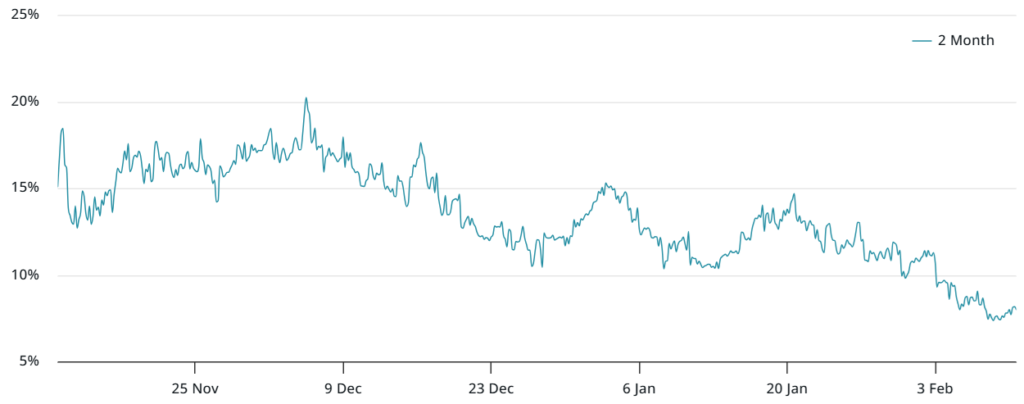 پریمیوم سالانه ۸٪ فعلی در معاملات آتی بیت کوین به طور قابل توجهی کمتر از ۱۱٪ ثبت شده در ۱ فوریه (۱۳ بهمن) و زیر آستانه صعودی ۱۰٪ باقی مانده است. این نشان میدهد که اشتیاق معاملهگران نهادی برای قرار گرفتن در معرض اهرمی بیت کوین بسیار کمتر از میانگینهای تاریخی است.