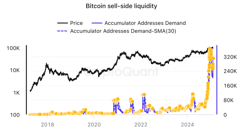 تقاضای آدرسهای انباشت کننده بیت کوین – منبع: کریپتوکوانت