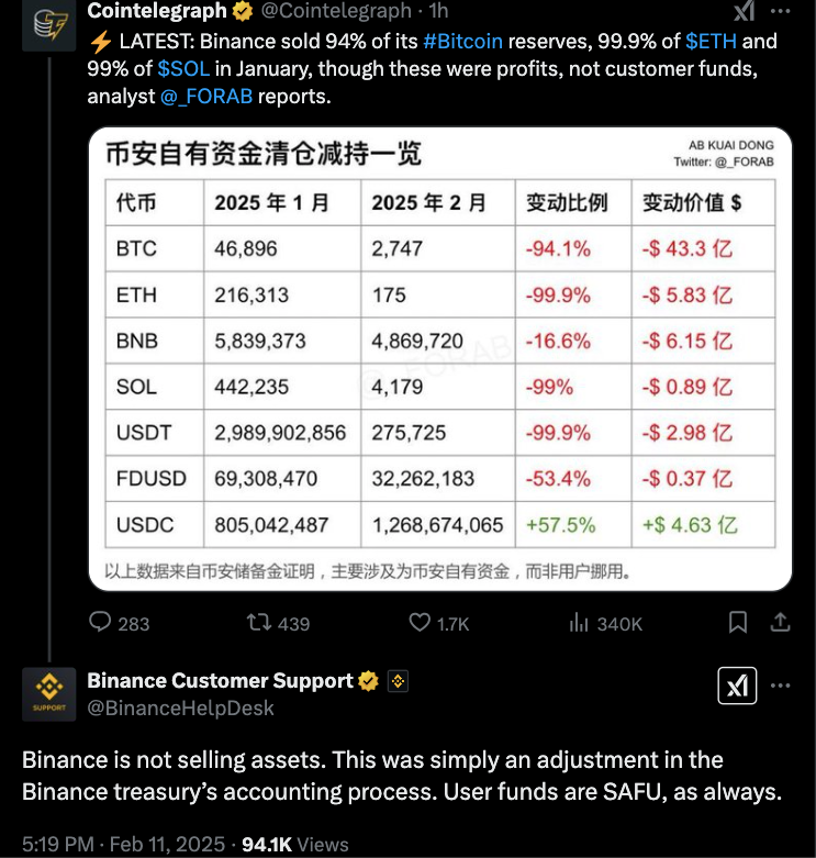 اگرچه این خبر جدید نبود، کاهش ذخایر رمزارز بایننس که شایعه شده بود ناشی از سود حاصل از داراییهای آن است، در آن روز به یک موضوع داغ در شبکههای اجتماعی تبدیل شد و بایننس متعاقباً این ادعاها را رد کرد.