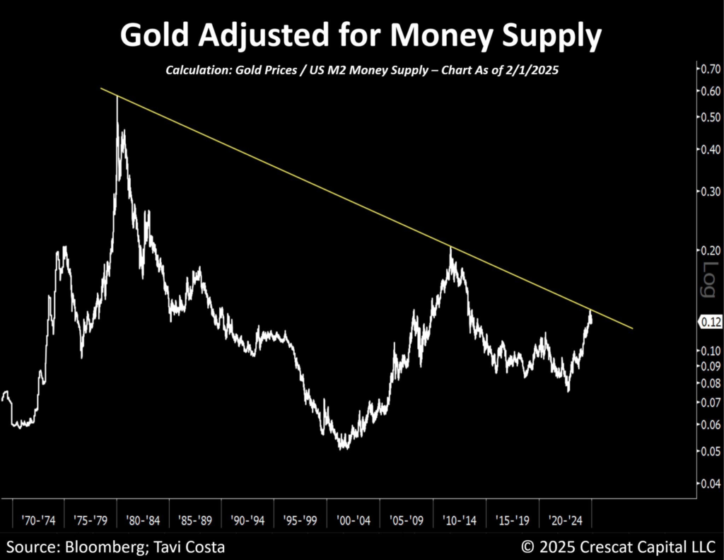 طلا با احتساب عرضه پول M2 ایالات متحده – منبع: کابیسی لتر