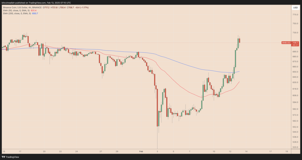 در میان ۳۰ ارز دیجیتال برتر بازار، BNB بهترین عملکرد را داشت و با رشد ۱۲٪، به حدود ۷۱۱ دلار دست یافت. در حالی که بسیاری از ارزهای دیجیتال بزرگ بازار در وضعیت نزولی قرار داشتند.