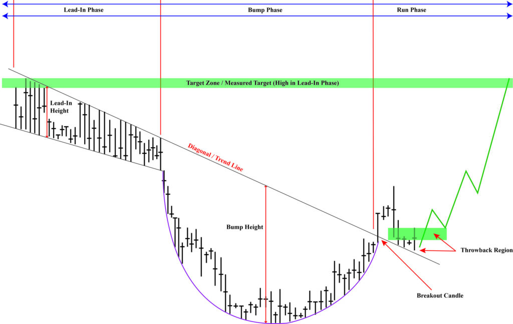 الگوی BARR Bottom شامل سه مرحله آغاز روند (Lead-in)، سقوط (Bump) و بازگشت صعودی (Run) است.