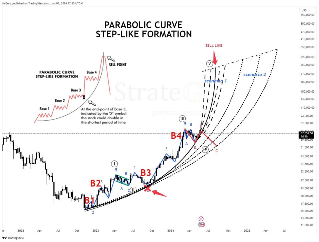 در همین حال، لاگن از تئوری امواج الیوت (Elliott Wave Theory) برای پیشبینی اهداف شکست صعودی بیت کوین استفاده کرده است و مسیر قیمت آن را پس از فازهای انباشت متوالی در الگوی مگافون ترسیم میکند.
