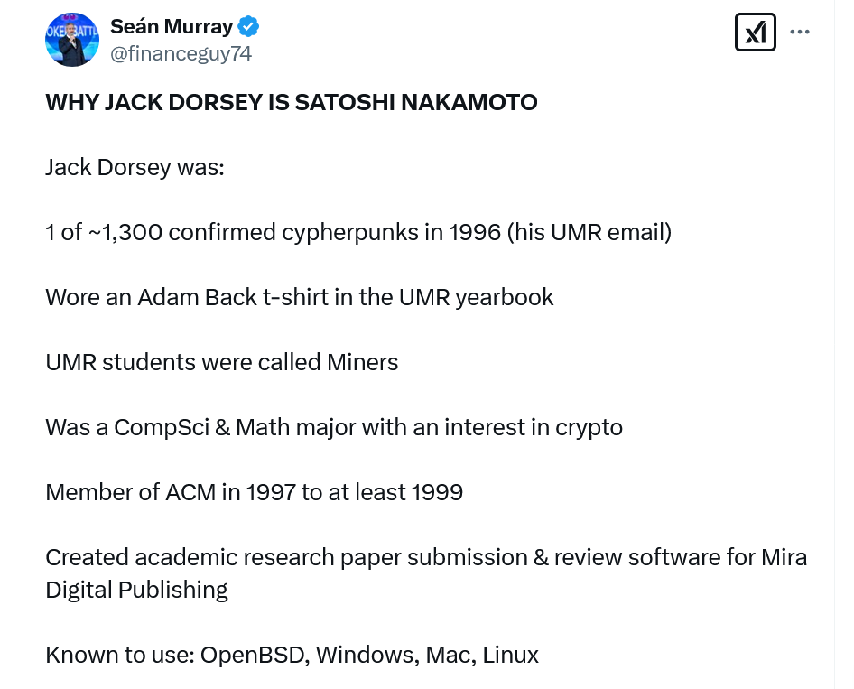به گزارش میهن بلاکچین، شان موری (Seán Murray)، رئیس و سردبیر وبسایت خبری مالی دیبنکد (deBanked)، در پستی در ۱۵ فوریه (۲۷ بهمن) در X، فهرست بزرگی از حقایق، اعداد و تاریخهای مرتبط با بیت کوین را گردآوری کرد که به گفته او با دورسی، کسی که بیش از یک دهه یکی از قویترین حامیان بیت کوین بوده، مرتبط است. با این حال، دیگران استدلال میکنند که شواهد قطعی نیستند.