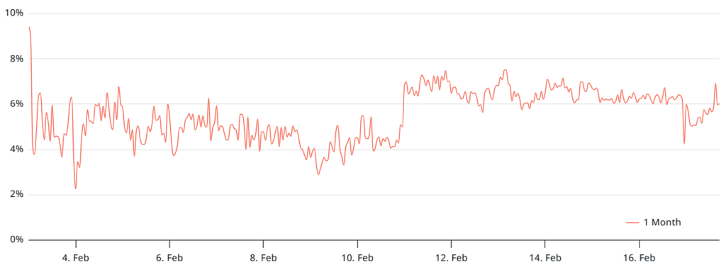نرخ مبنای معاملات آتی اتر که احساسات معاملهگران بازار مشتقه را نشان میدهد، در تاریخ ۱۷ فوریه (۲۹ بهمن) در سطح نسبتاً ثابت ۶٪ باقی ماند. بهطور معمول، قراردادهای آتی ماهانه ETH با ۵٪ تا ۱۰٪ پریمیوم نسبت به بازار اسپات معامله میشوند تا دوره تسویه طولانیتر را جبران کنند.