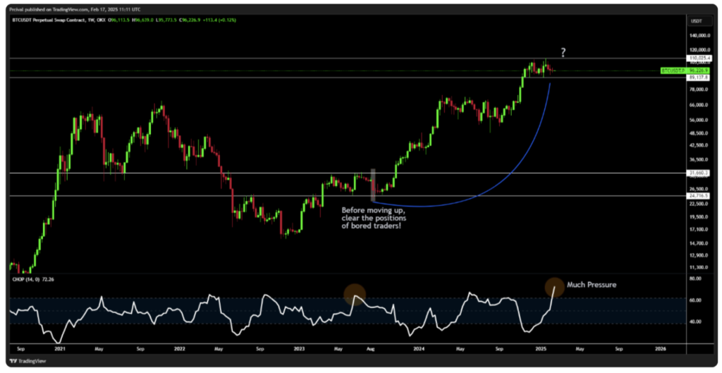 پرسیوال در ادامه تحلیل خود اشاره کرده که در سال ۲۰۲۳، بیت کوین قبل از آغاز روند صعودی خودش، ابتدا تمامی معاملهگرانی که پوزیشن «کسل کننده» و مخالفی در بازار داشتند را خارج کرد. این اتفاق ناشی از دورهای از نوسانات پایین بود که در نهایت به انباشت نقدینگی و حرکت صعودی شدید منجر شد.