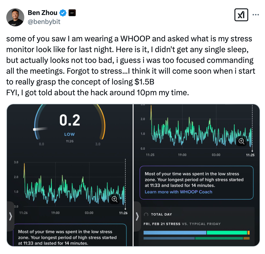 به گزارش میهن بلاکچین، او در تاریخ ۲۲ فوریه (۴ اسفند) در پستی در X نوشت: «۱۲ ساعت از بدترین هک تاریخ میگذرد. تمامی برداشتها پردازش شدهاند. سیستم برداشت ما اکنون کاملاً به سرعت عادی بازگشته است».